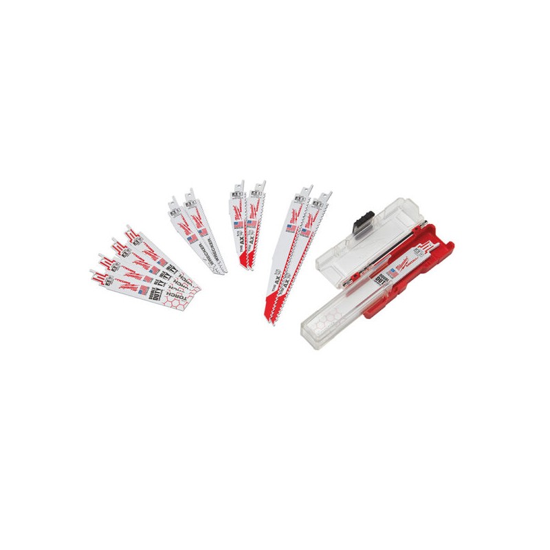 El juego de seguetas Sawzall® de Milwaukee® de 12 piezas cuenta con una selección de nuestras hojas de demolición más populares para una amplia variedad de aplicaciones profesionales. Las seguetas de demolición de Milwaukee® son más gruesas para una durabilidad máxima y más largas para realizar cortes más rectos. El juego cuenta con el accesorio The Ax™ para cortar madera con clavos incrustados, The Wrecker™ para cortes de demolición de uso general y The Torch® para cortar metal. El juego también incluye una funda duradera e innovadora para el lugar de trabajo para un almacenamiento conveniente de las hojas.,Características:,Incluye las nuevas hojas para madera que cuentan con NAIL GUARD™ y FANG TIP™