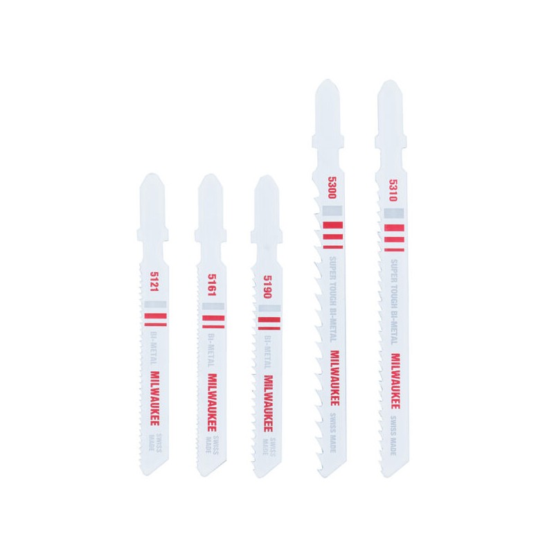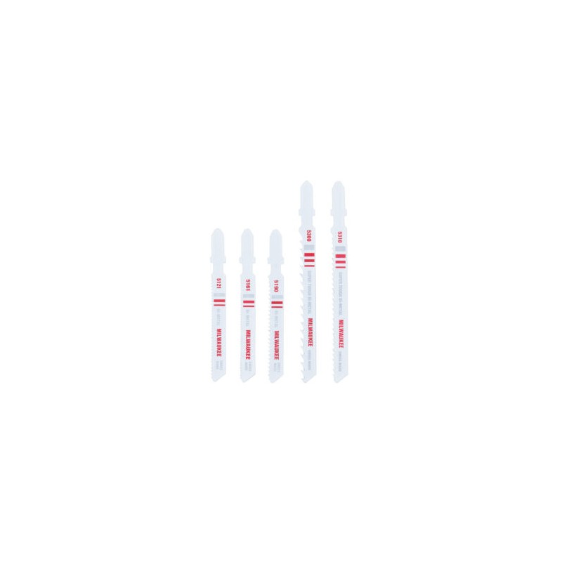 Las seguetas para sierra caladora bi-metal están diseñadas y fabricadas para el usuario profesional, las seguetas bi-metal duran más que las hojas de acero alta velocidad (AAV) o las de carbón. El detalle en el material, la forma y el filo de los dientes hacen que estas seguetas realicen cortes limpios y rápidos y tengan una larga vida útil. Tienen espiga en T y es compatible con las sierras caladoras Milwaukee modelo 6266-6, 6276-6, 6267-20, 6267-21 y otros modelos de marcas populares. Incluye cinco seguetas diferentes: una de 6 TPI 4 pulg largo para madera, una de 10 TPI 4 pulg largo para madera, una de 14 TPI 3 pulg largo para metal, una de 18 TPI 3 pulg largo para metal y una de 24 TPI 3 pulg largo para metal.